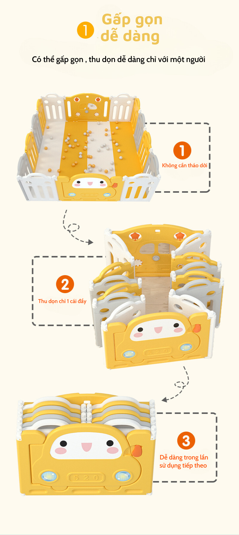 Thiết kế trơn nhẵn, an toàn cho trẻ, dễ dàng vệ sinh. Có thể kết hợp cùng bóng, cầu trượt tạo thành khu vui chơi liên hoàn tại nhà cho bé